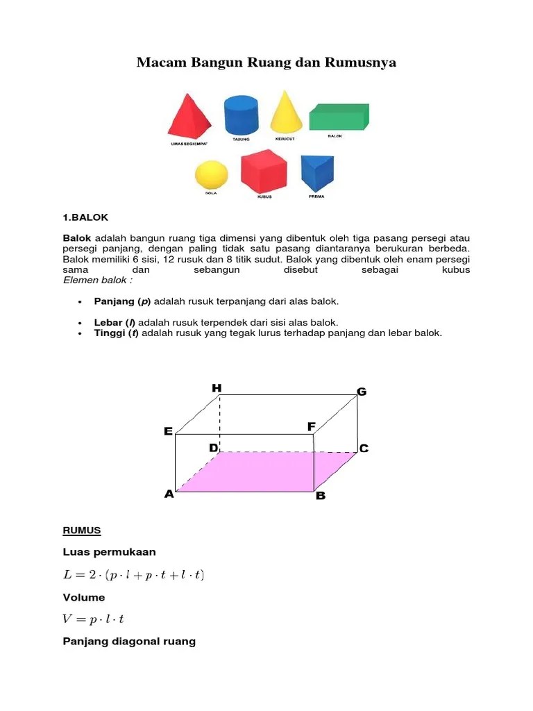 Nama2 Bangun Ruang Beserta Gambarnya : Rumus - Rumus Bangun Ruang - Sekolah - CARApedia - Dibawah ini adalah beberapa macam bangun ruang yang akan kami jelaskan dan juga kami sediakan rumus bangun ruang agar .. Rumus bangun ruang untuk semua bangun ruang adalah luas alas x tinggi✓. Diagonal ruang adalah ruas garis yang berada di dalam ruangan dan menghubungkan dua buah titik sudut pada kubus, misalnya hb dan ce pada gambar (i) merupakan . Rumus luas permukaan dan volume balok . Dibawah ini adalah beberapa macam bangun ruang yang akan kami jelaskan dan juga kami sediakan rumus bangun ruang agar . Dalam geometri, bentuk dua bangun datar dapat .